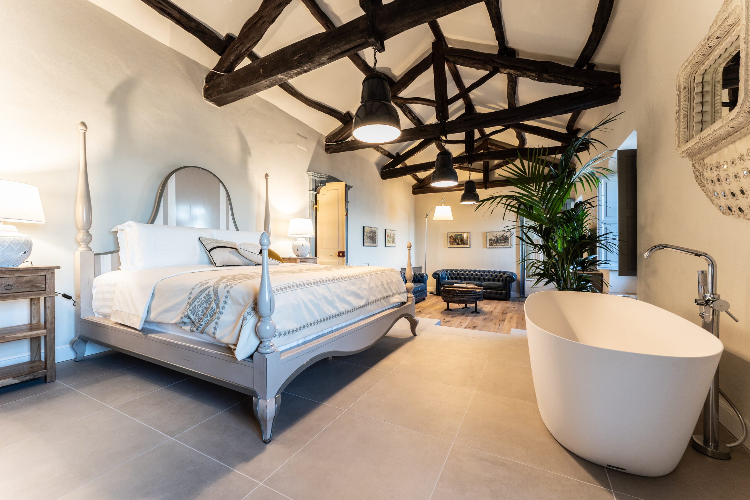 L’ampio open space si sviluppa in maniera lineare, offrendo una vista mozzafiato sul mare attraverso le tre grandi finestre incorniciate da capriate in legno di ginepro. Il letto king size, posizionato su una sopraelevazione, amplifica la sensazione di libertà e di infinito che pervade l’ambiente.